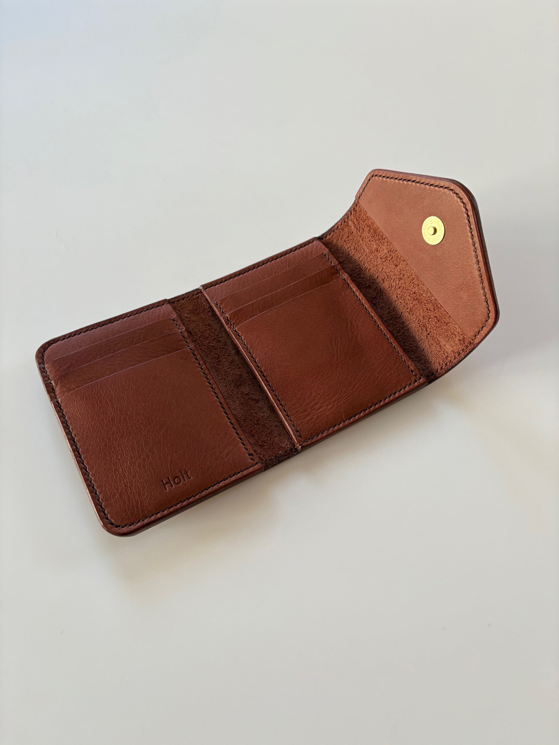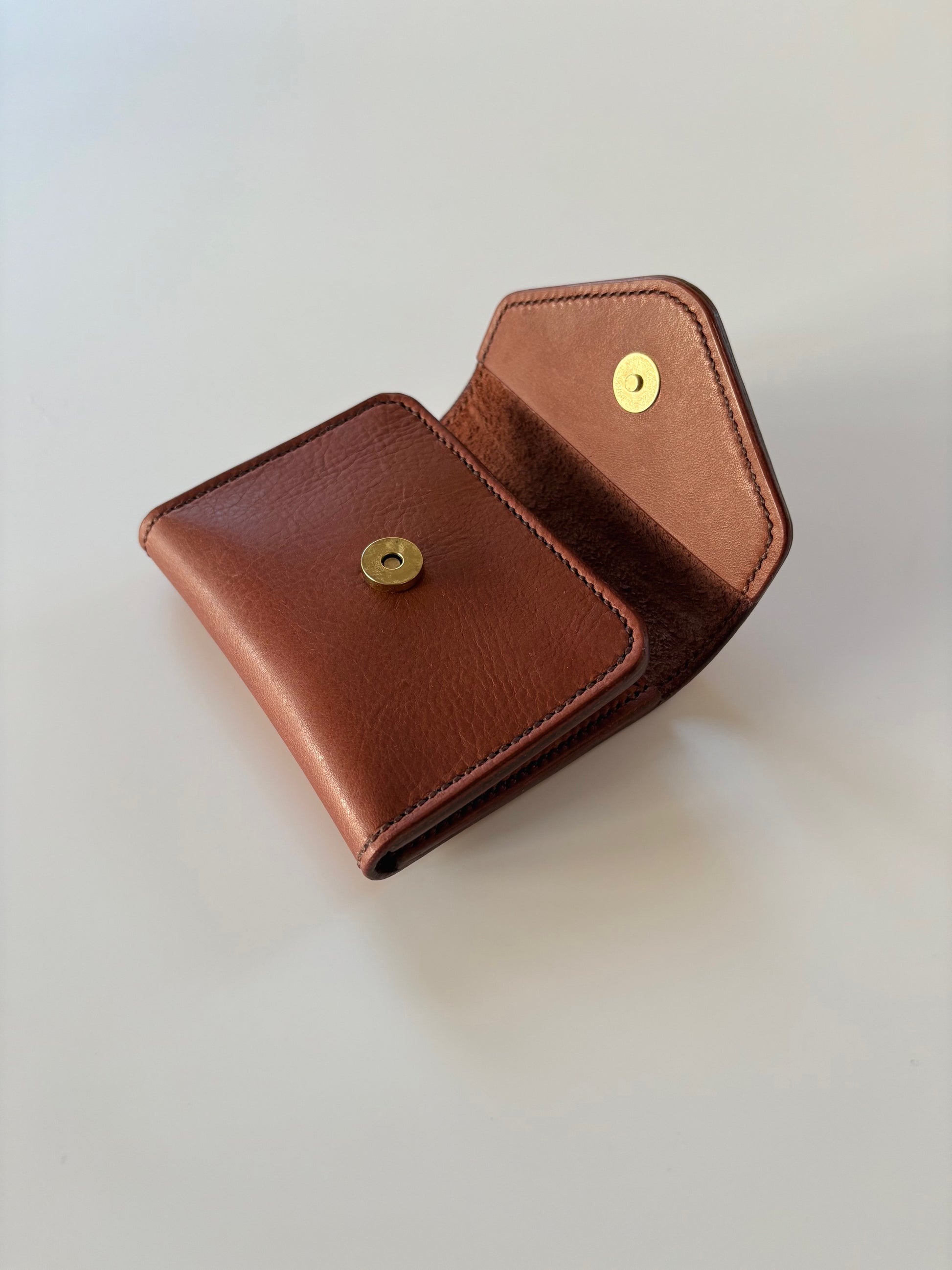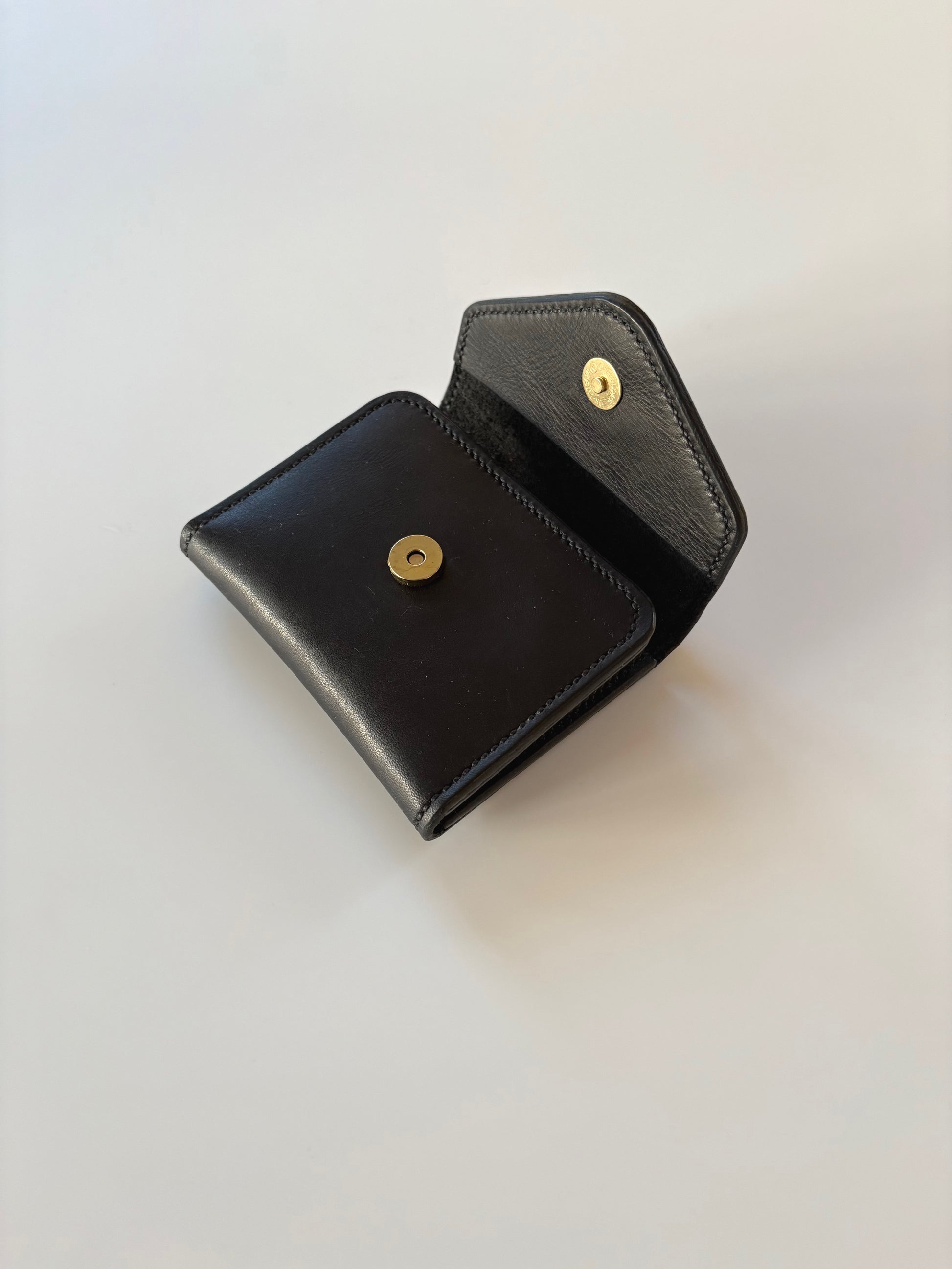 The foldout has three card slots and a pocket on the left and three card slots on the right. It folds with an envelope flap and brass magnet closure.