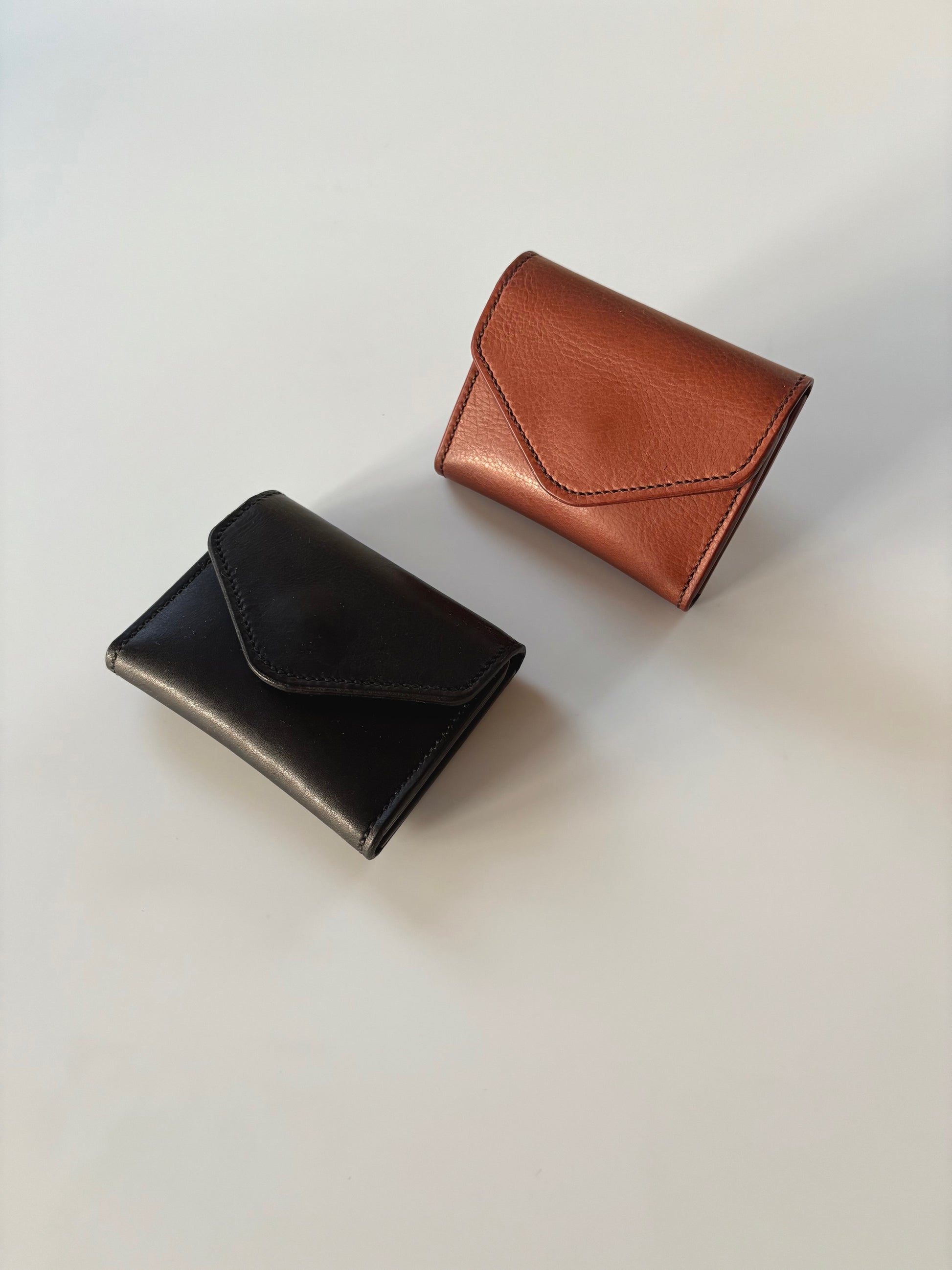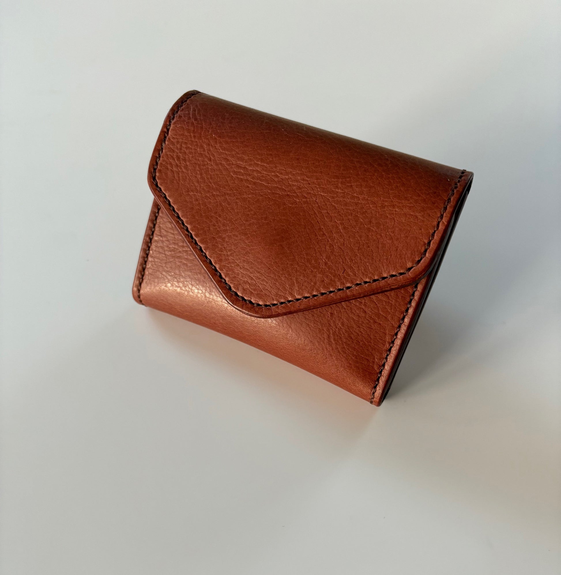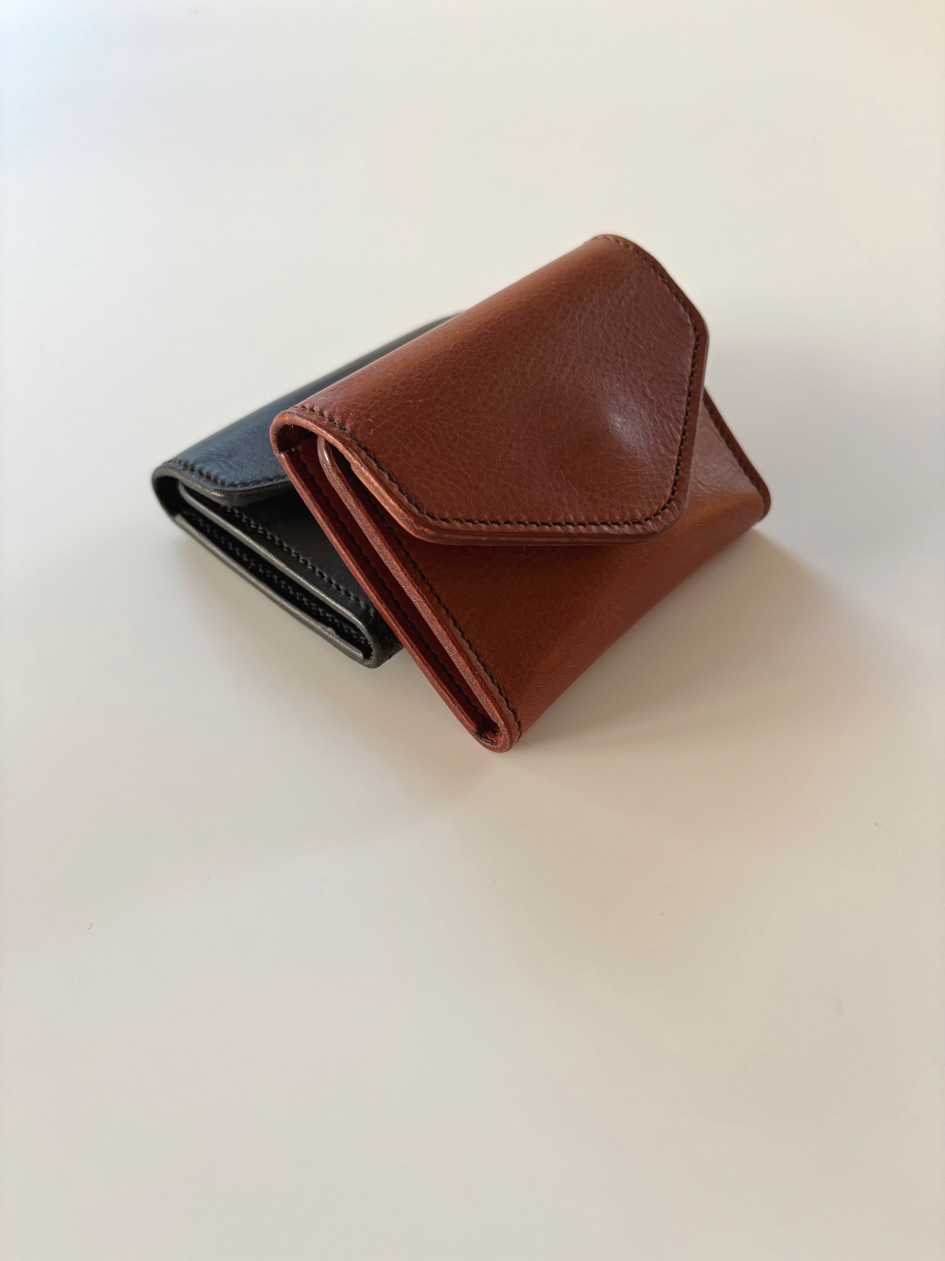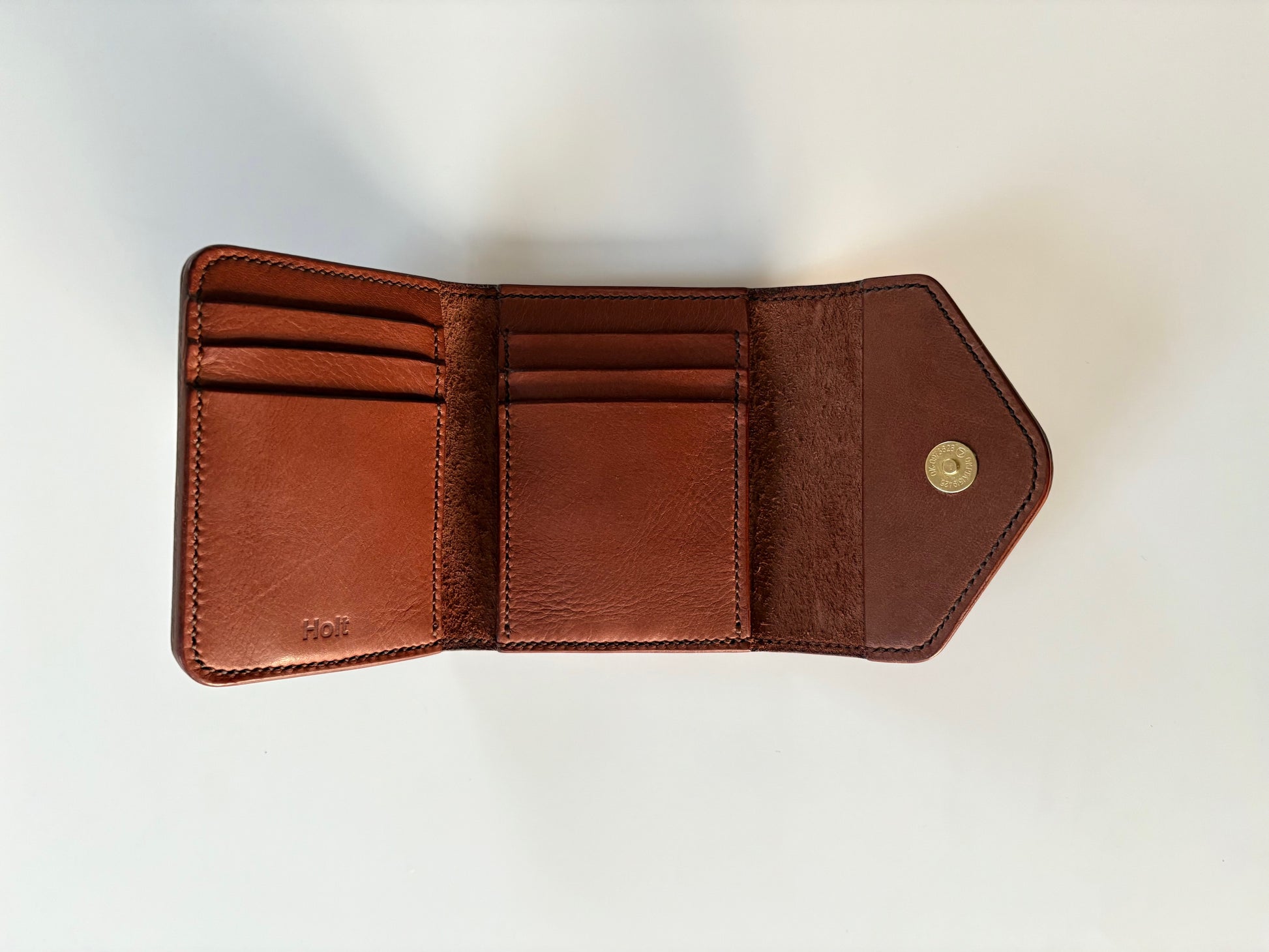The foldout has three card slots and a pocket on the left and three card slots on the right. It folds with an envelope flap and brass magnet closure.